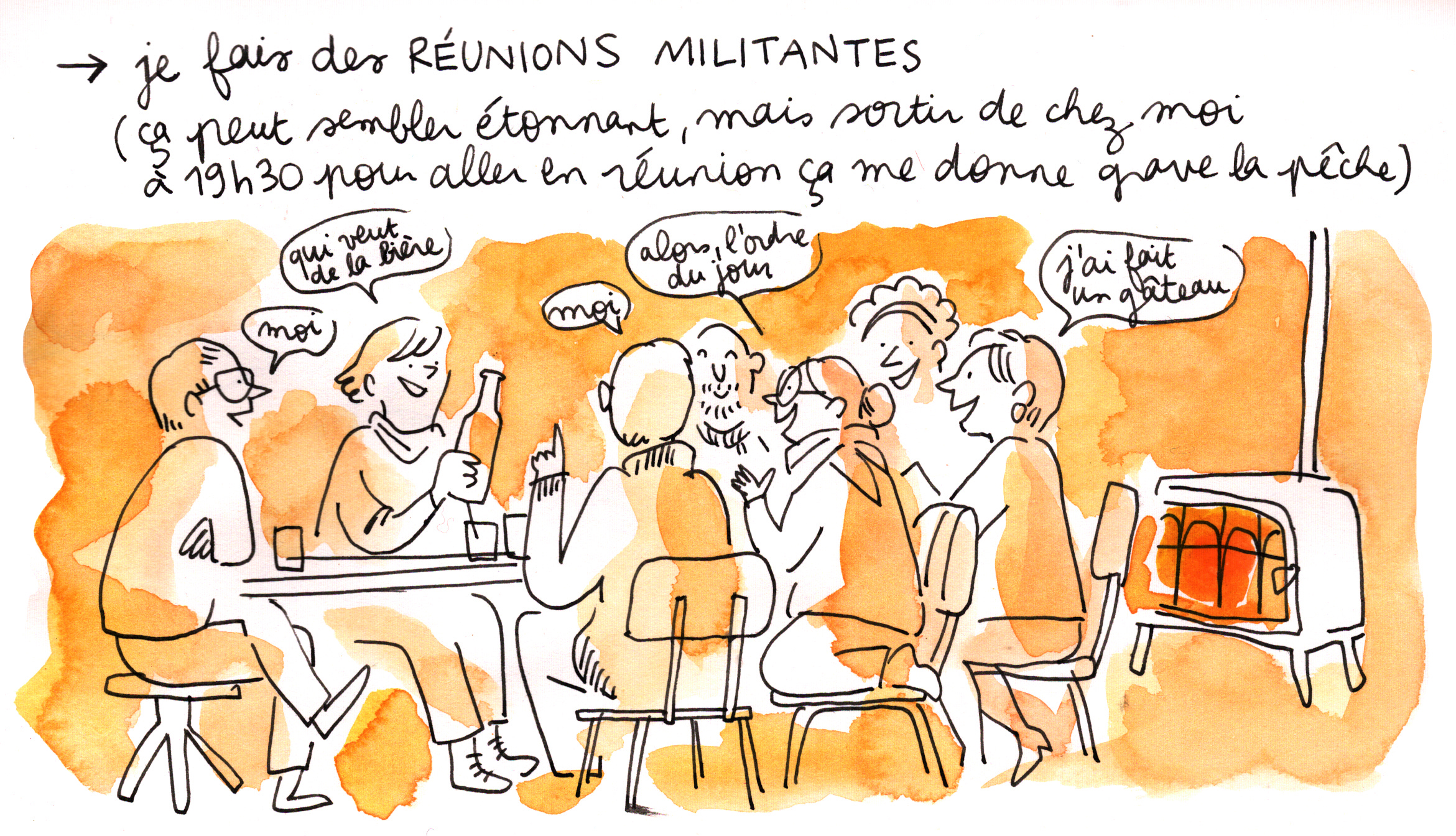 Et ça me fait mal d’écrire ça parce que certes la coach en santé mentale dans ma tête dit “mais évidemment que prendre soin de soi c’est nécessaire, t’arrête pas de le dire, et oui ça passe par faire des trucs apparemment inutiles” mais la militante lui répond qu’avec tout ce que j’ai comme privilèges, c’est juste une excuse à deux balles pour en faire moins et pouvoir être égoïste tout en ayant l’impression de ne pas trahir mes idéaux.