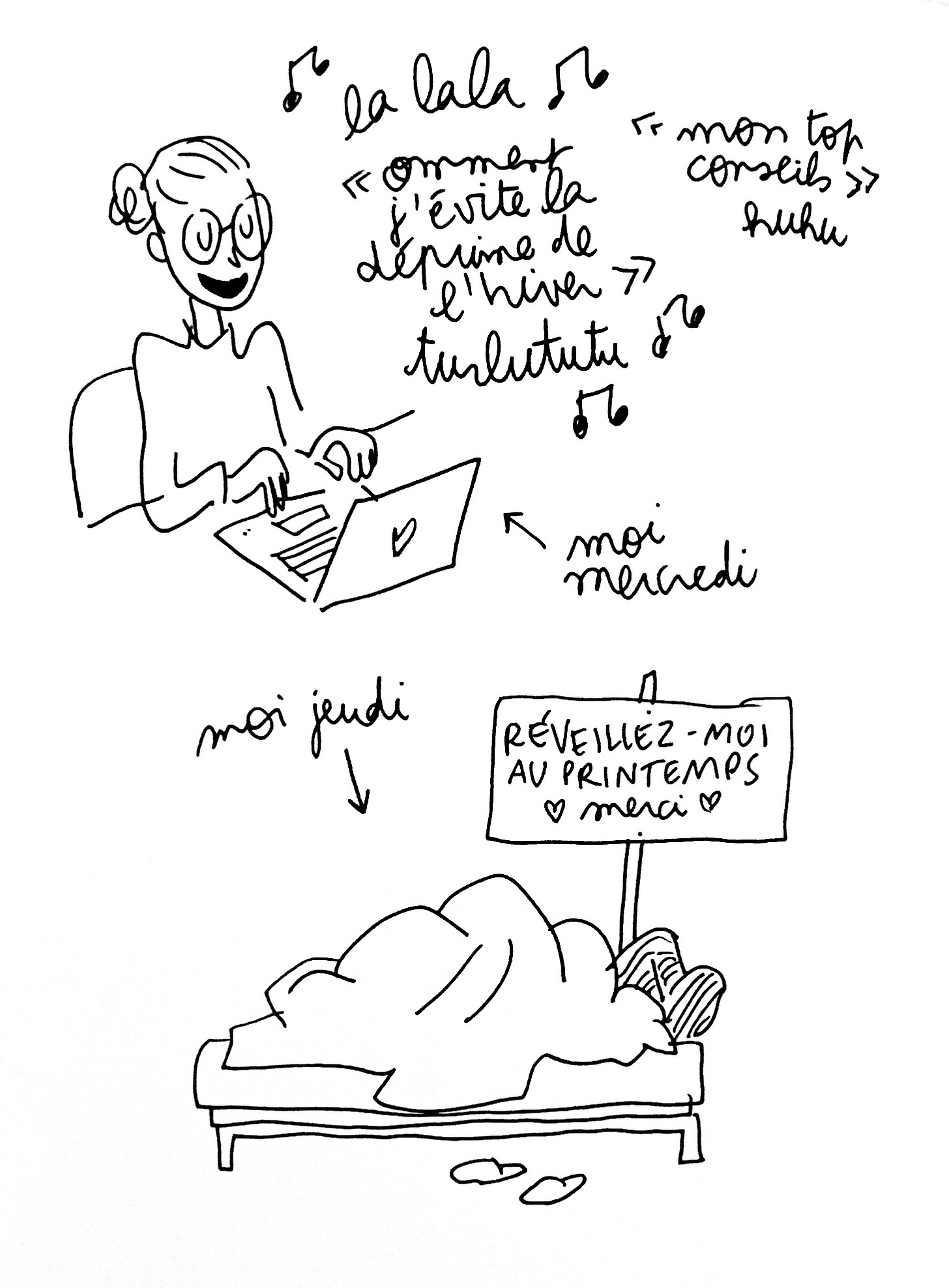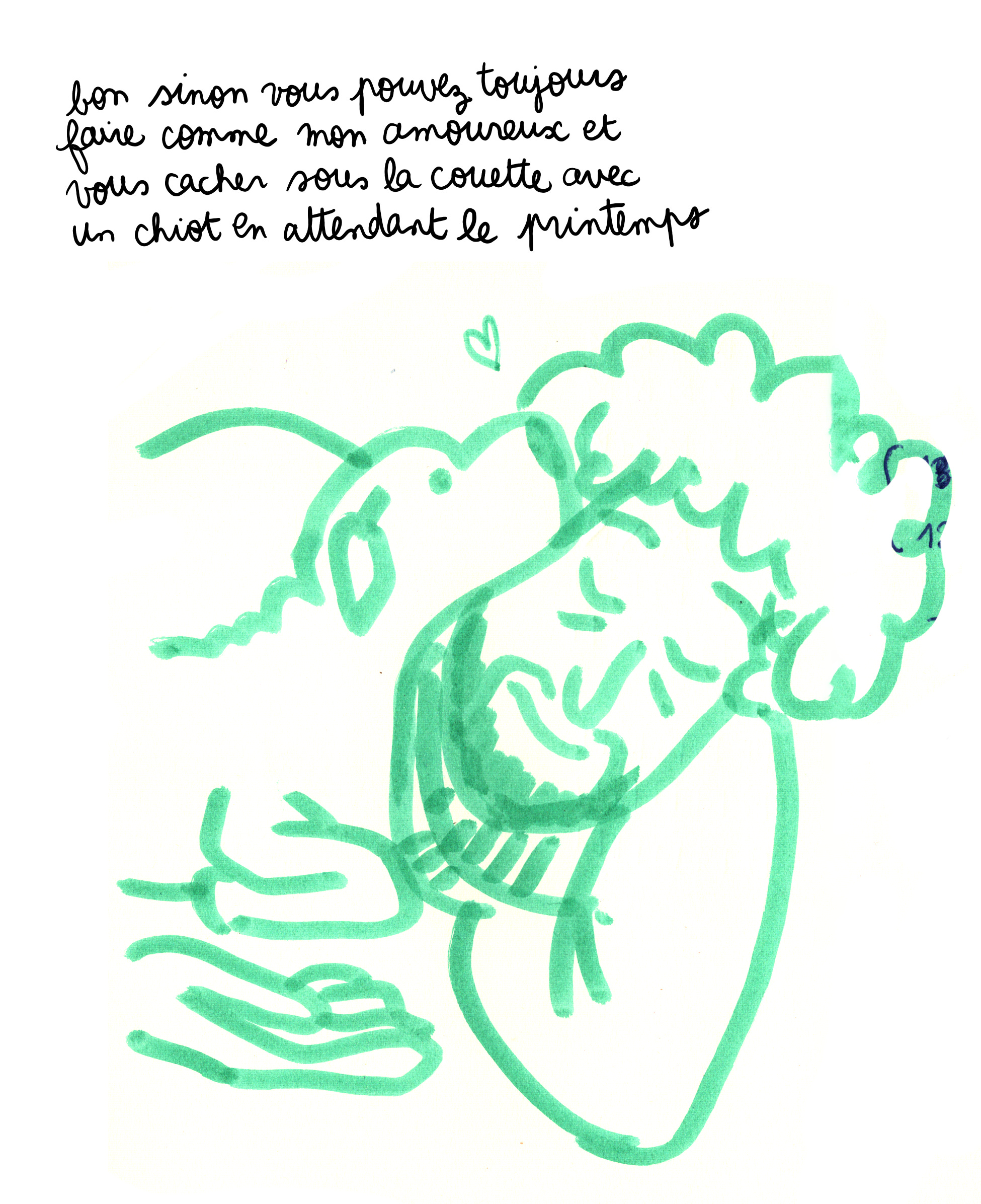 Donc bon, parfois une bonne hygiène de vie ça ne suffit pas, je vais arrêter avec mes salades à la sauce développement personnelle, la vérité c’est que pour aller bien il faut aussi (surtout) de l’indulgence envers soi-même et des proches qui prennent le relais quand ça ne va pas.