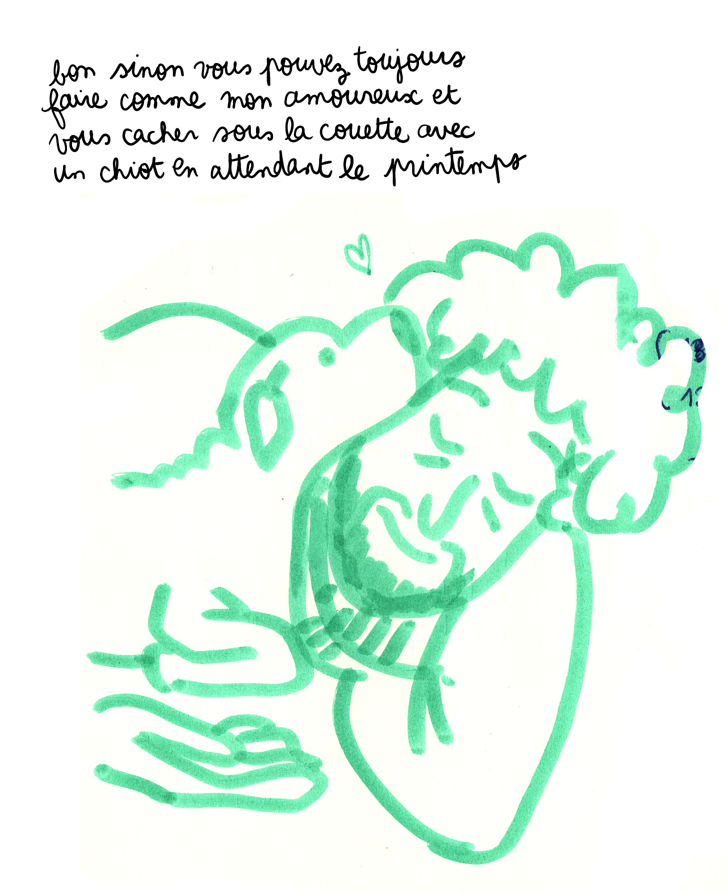 En tous cas, je suis immensément reconnaissante à ma formidable toile de soutien1 et je mesure ma chance d’être si bien entourée. J’espère que votre hiver à vous n’est pas trop rude, et que vous avez aussi des ami·es avec qui le partager.